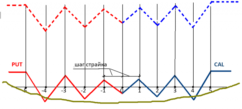 Суть алгоритма- одновременное зарабатывание сразу на нескольких заданных (задаётся шаг) страйках (как путов, так и колов) при колебаниях цены на них, причём макс. объём на каждом страйке так же задаётся в настройке. Постоянно торгуя на этих страйках, робот должен поддерживать «змейку», чтобы на экспирацию выйти с такой экспозицией,( пунктирный график).