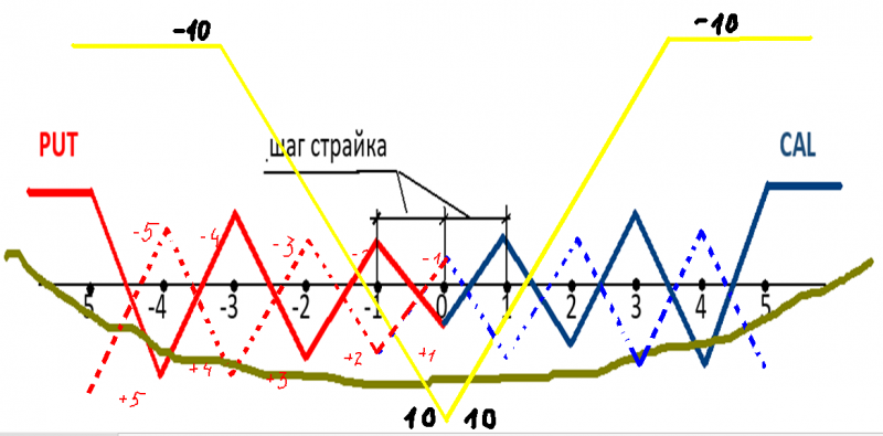 Одновременно котируем по улыбки волатильности на заданных страйках с заданными максимальными конечными объёмами опционы PUT и CAL, чтобы к моменту экспирации могла бы получится такая вот экспозиция. Одновременно можно вести и алгоритмическую торговлю бабочки (описана ранее). Она скомпенсирует потери от змеек, если выбрать их с крайними проданными краями (суммарная проданная волатильность) при выходе цены БА за какой-либо из краёв змеек.Нужно иметь ввиду, что центральный нулевой страйк (ЦС) подвержен изменению по мере движения БА. Это значит, что при смене ЦС нужно начинать работу с новыми змейками, а старые законсервировать и т.д. Не знаю, что из этого может получится, нужен эксперимент.
